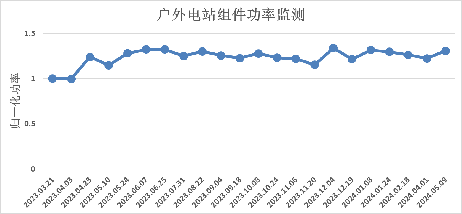 户外实证是对光伏产品进行稳定性与可靠性检验的最直接手段。极电光能去年3月搭建了钙钛矿户外实证电站,目前已运行了13个月。运行期间对组件功率进行定期测试,结果显示,组件功率没有衰减,反而略有提升。