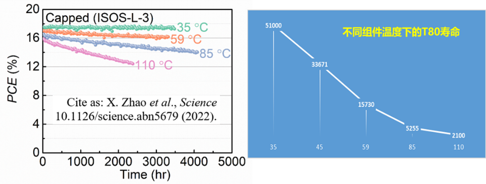 钙钛矿组件寿命到底能不能达到25年或者更长?实际上,学界已有很多的实验数据的为这一问题做出了解答。比如,2022年,Science上发表了一篇关于钙钛矿电池稳定性的文章(Z. Zhao et al, Science,10.1126/science.abn5679(2022)。作者通过界面钝化等手段提升钙钛矿太阳电池的稳定性,并对钙钛矿太阳电池在35-110°C、65%相对湿度、1200W/m2的辐照下(1.2sun/35-110°C/65%RH)进行加速老化。结果显示,当温度为35°C时,老化3531小时后无任何衰退;随着老化温度的升高,可以观察到电池效率的衰减,温度越高衰减越快。当温度为110°C时老化2100小时,效率衰退20%(如下图所示)。下图同时展示了不同老化温度下,功率保持80%的时间(T80寿命)。