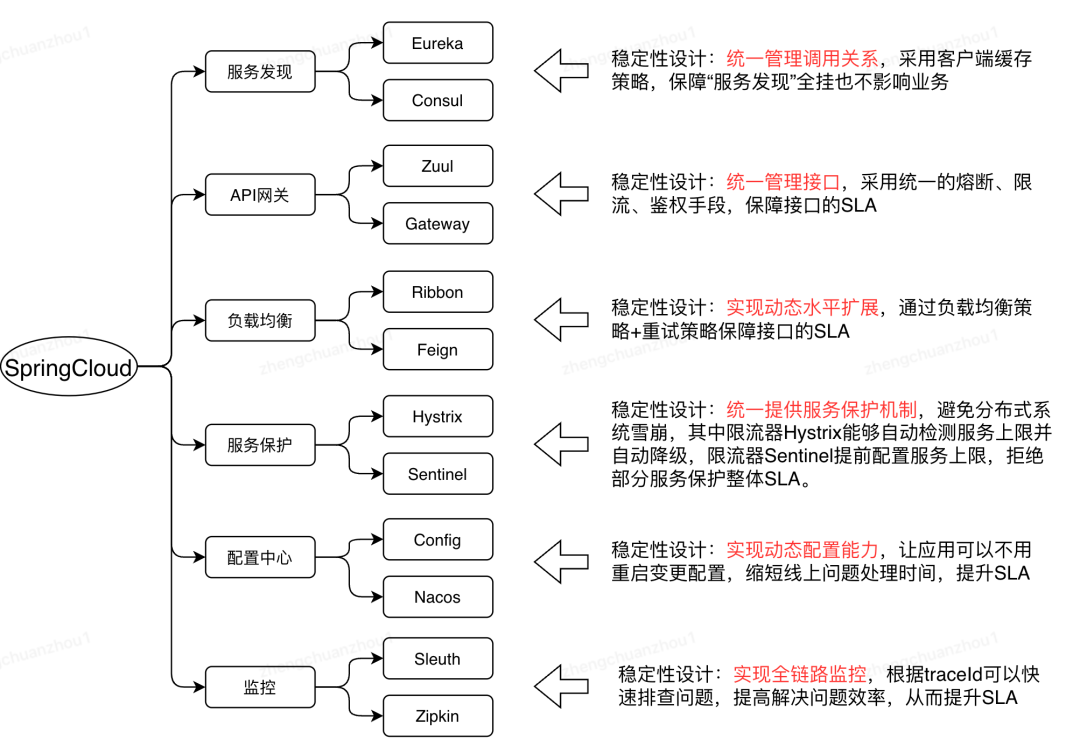 以 SpringCloud 全家桶为例,提供了很多组件,帮助我们保障系统稳定性,如下图: