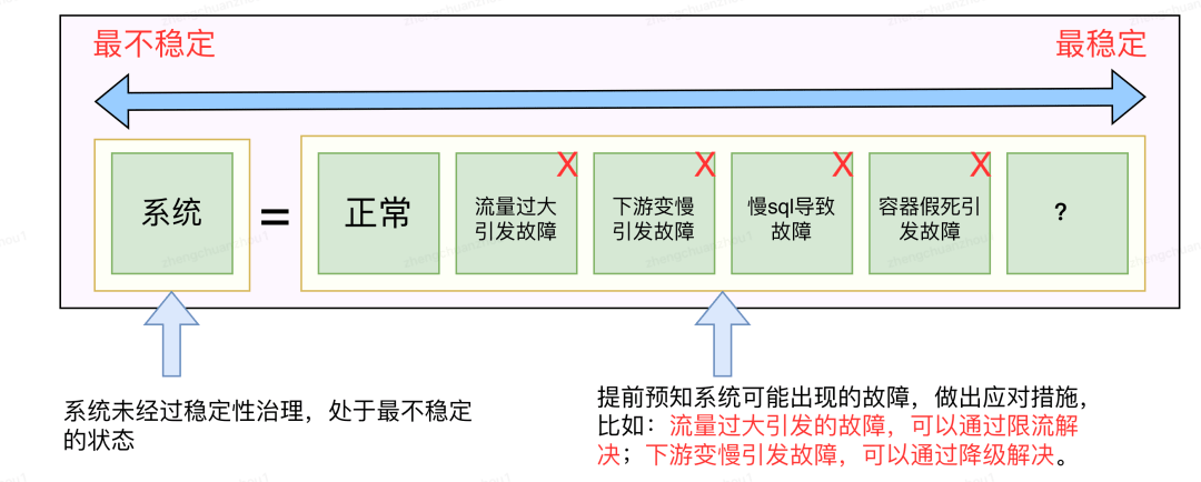稳定性建设本质上是对抗熵增原理的过程,具体是通过一些技术手段(比如超时治理、限流治理、降级治理、慢 SQL 等),提前对系统可能出现的故障,建设应对措施,从而让系统按照设计目标去运行。