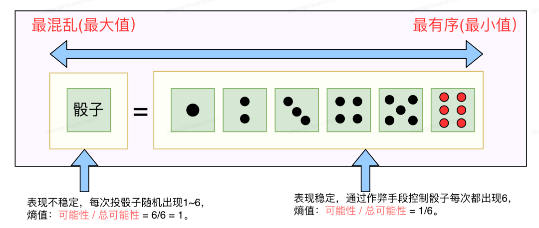 下图中,我们使用 “熵” 值来衡量 “骰子系统” 的混乱程度,1(最大值)表示 “最混乱”,意味着我们不能控制 “投骰子” 的结果,每次投骰子的结果会在 1~6 随机出现,系统表现不稳定;1/6(最小值)表示 “最有序”,意味着我们能够控制 “投骰子” 的结果,系统表现稳定,比如我们希望每次投筛子的结果都是 6,我们可以引入作弊手段(即借助外力),让每次投骰子结果都是 6。