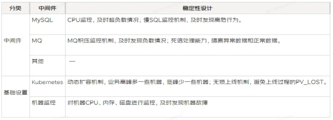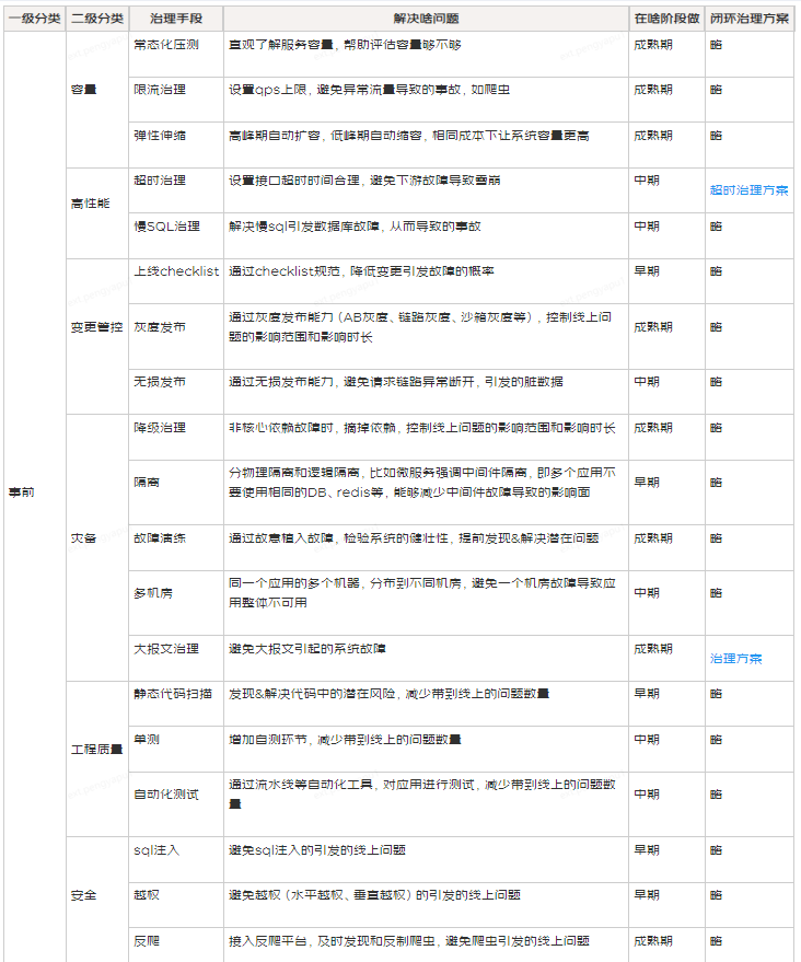 最佳实践是:搭建一个稳定性治理的框架,把稳定性治理手段填充进去,根据业务所处阶段,选择适合当下的稳定性治理手段,可以通过如下的表格进行管理: