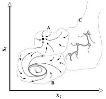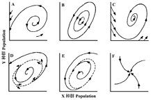 图2D~2F增加了一些复杂性,在某种意义上,图2D是A和C的组合,在相平面的中央,所有可能的轨迹都向内螺旋进平衡,而在这个区域外的都向外螺旋,最终导致的一个或另一个灭绝。这与图2C的全域稳定性(global stability)相反,是一个局域稳定性(local stabilty)的例子。他指定表现稳定性的区域为吸引域(domain of attraction),包含该域的线为吸引域的边界(boundary)。图2E的行为正好相反,在一个内部的区域,轨迹向外螺旋至一个稳定极限环(a stable limit cycle),如果越过了该环,轨迹再向内接近它。最后,图2F显示一个稳定节(stable node),此时无震荡,轨迹单调地接近节点。这六种图形能以几乎无限变化方式组合产生若干吸引域,在其中能见到稳定平衡、稳定极限环、稳定节点或中性稳定轨道。