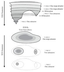 在一个拥有多个吸引子的动态系统,一些关键参数的连续变化能导致系统稳定性景观的不连续变化(图5),这些不连续体(discontinuities)在动态系统数学理论中称为分叉(bifurcations),在灾害理论中称为灾变(catastrophes)。
