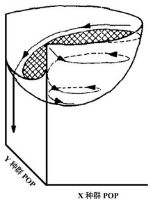 设想在一个恒定环境中向一个或二个种群施加的扰动将导致种群波动,其振幅将逐渐减小,这可用图1来表示,这里每个种群的时间波动显示在盒子的侧面。在这个例中,二个种群在某种意义上是相互调控的,但是滞后响应导致了一系列的振动,其每个种群的振幅逐渐减小到一个恒定的值。但是,如果我们也关心持续性(persistence),那我们将不仅想知道这二个种群是如何从特定的一对初始值开始其行为轨迹,而且想知道所有可能的成对值,因为也许就存在若干个初始种群组合可导致二个种群中的一个或另一个灭亡。但是,在时间轴上显示可能响应的全部变化是非常困难的,而在相平面上绘出轨迹被证明是方便的,如图4-1盒子底部所示,这里的二个轴表示二个种群的密度。在平面上的轨迹表示在一定的时间间隔二个种群序列的变化,每个点表示每个种群在特定时间点的特有的密度,箭头表明时间变化的方向。如果振动衰减,如显示的例子,该轨迹将呈现一个封闭的螺旋,最终达到一个稳定的平衡。