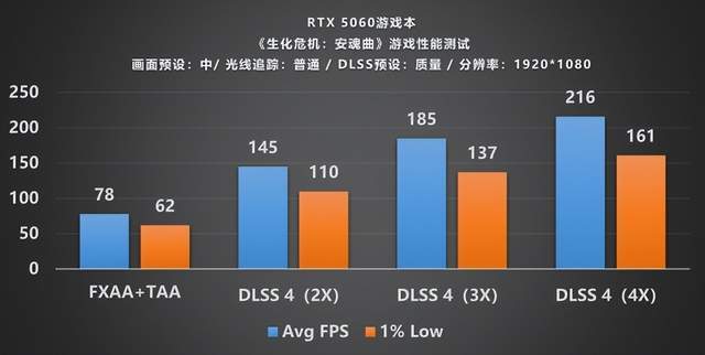 GeForce RTX 5060作为一款主打性价比的显卡,我们考虑测试2K和1080P分辨率下的性能表现。我们首先测试2K分辨率、普通光追档位的游戏画质;在原生FXAA+TAA的原生渲染下,平均帧数只有53帧;接下来打开DLSS 4多帧生成模式,档位调至2X时,原先的帧数突然翻倍,大幅提升至111帧,随之我们继续调节DLSS 4至3X,平均帧率又大幅上升至139帧,游玩体验可以说是丝滑无阻。不仅如此,当DLSS 4调整至4X时,帧数继续提高到159帧,丝滑游玩早已绰绰有余。