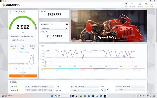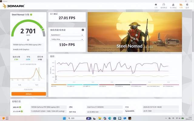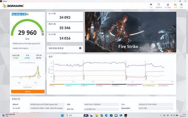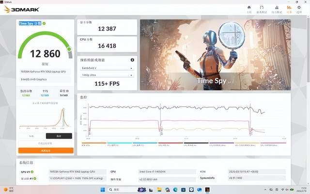 在常规的Fire Strike、Time Spy测试中,这台GeForce RTX 5060游戏本也是跑到了29960与12860的超高分数,位处3DMark两项测试排行榜的中上游水平。从结果来预判,无论是应对那些DirectX 11的经典游戏,还是支持更多现代化图形技术的DirectX 12游戏,这台游戏本都会有一个不错的游戏表现。