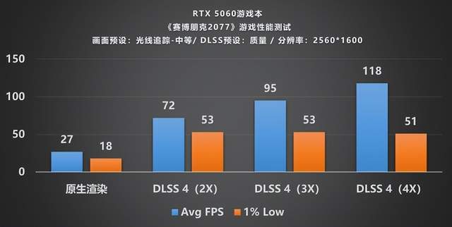 从结果不难看出,在2K分辨率与光线追踪“中等”预设的中高级别的负载下,整机原生渲染的帧率表现并不尽如人意,甚至未能达到30帧,仅停留在27帧以下,这种卡顿感对游戏体验造成了明显干扰。不过好在我们使用的是支持DLSS 4以及多帧生成技术的RTX 5060显卡,在仅开启2倍多帧生成的情况下,帧数竟直接翻了将近3倍,来到72帧的平均帧数,增幅之夸张令人咂舌;若进一步开启DLSS 4 4倍多帧生成,帧率提升更是直逼118帧,相较于原生渲染完全不可同日而语,帧率增幅直接超出了372%之多,性能强悍恐怖如斯。